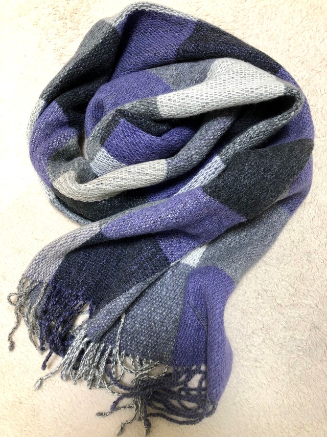 カシミアストール グレー、アイボリー、パープルの3色を昼夜織りの市松に織りました。昼夜織りにすることにより色が混ざり合い、微妙な色合いが生まれます。 幅43cm 長さ147cm(房8cm)