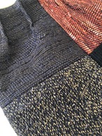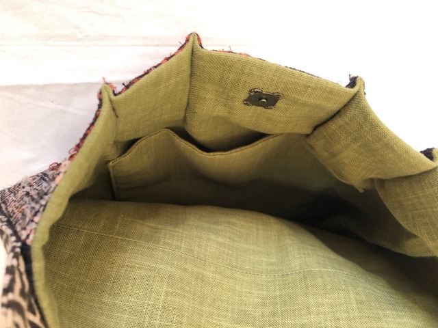 全体的に茶系の裂き織り地を組み合わせて、ショルダーバッグ にしました。 全面に入れたタックでぷっくりした形になりました。また、裏面に大きめのポケットをアクセントとして付け、気分でどちら向きに持っても良いのでは…。 内ポケット、マグネットボタン付き。 幅32cm 高さ32cm