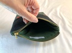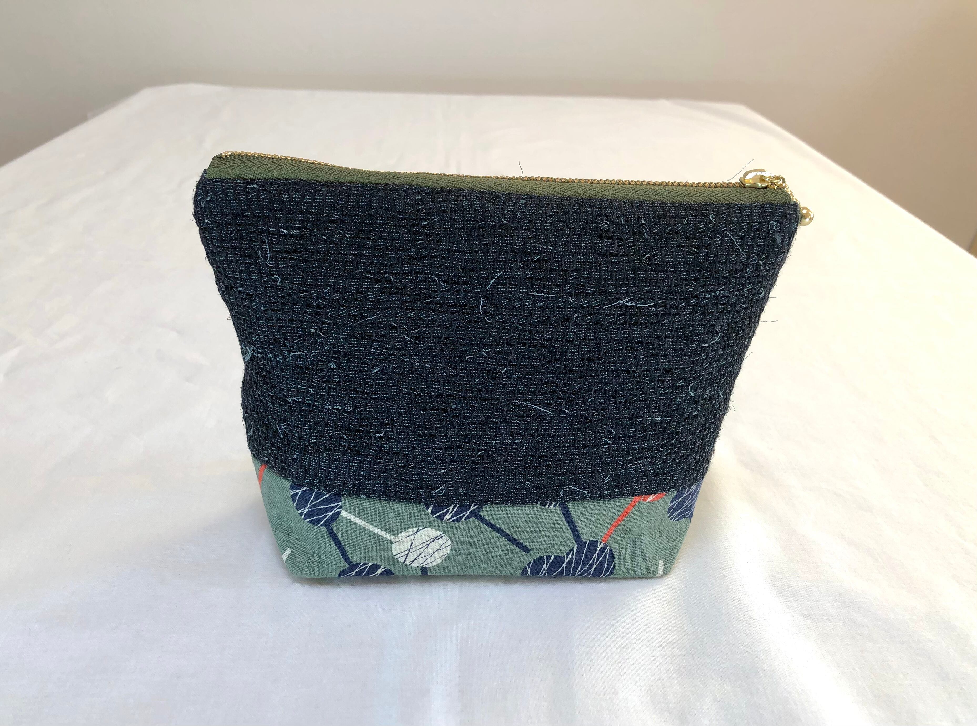 濃い緑色の着物の裂き布を使用。 上部が無地なので、下部に同系色の風船模様の綿プリント地を合わせました。 幅20cm 高さ14.5cm 底マチ7cm