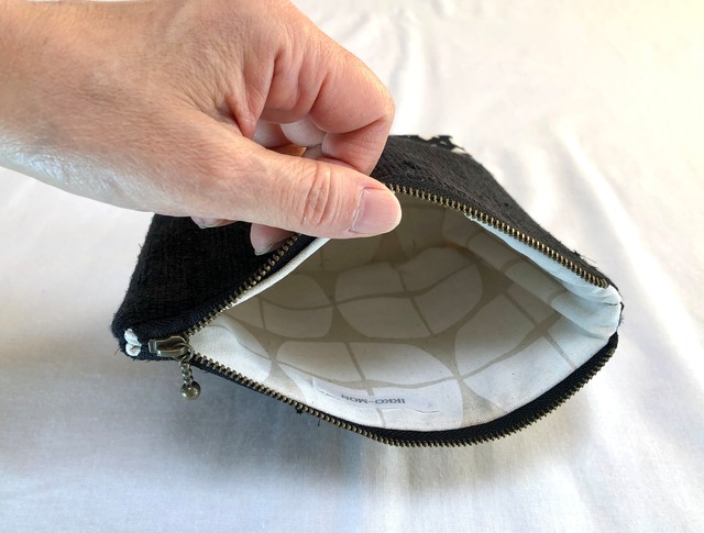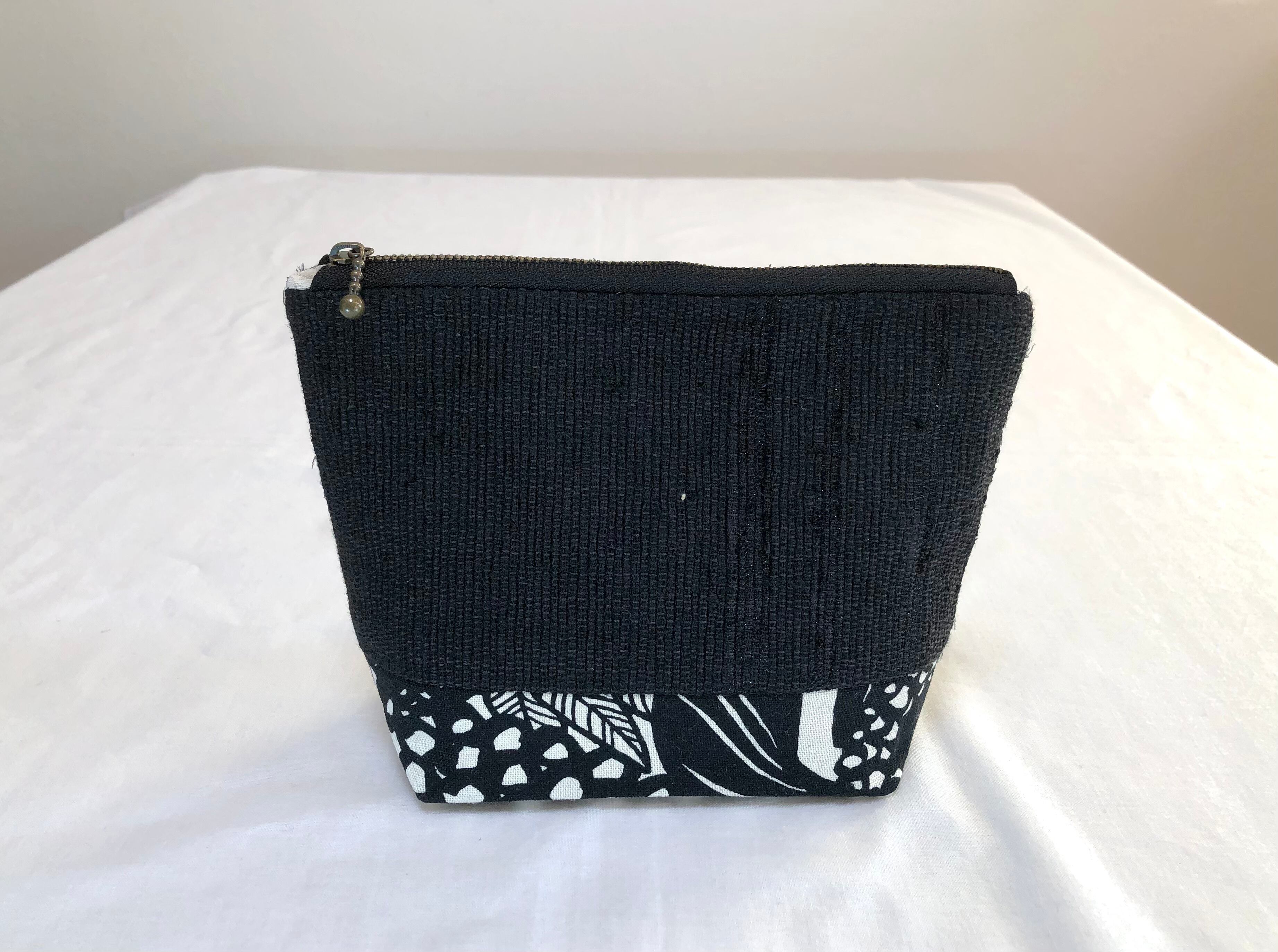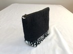 黒の絹着物、黒のラメ混着物を組み合わせた裂き織り地を使用。下部に大胆な黒の模様の綿を組み合わせました。 幅20cm 高さ14.5cm 底マチ7cm