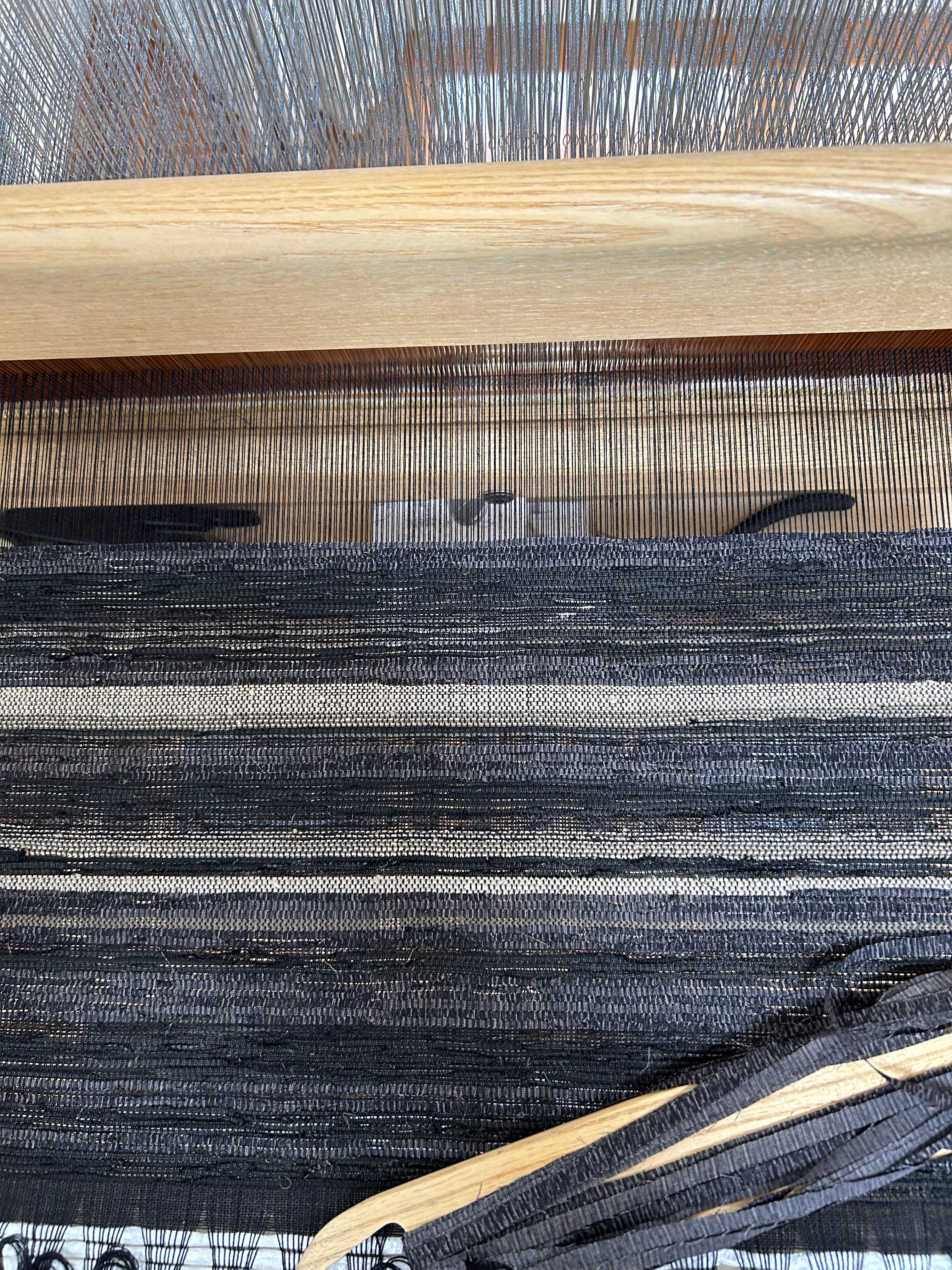 黒系の絹着物の裂き織りに一部ベージュ系のシルクを織り込んだニュアンスのある織り地を生かすためにシンプルな形に仕上げました。 大ぶりなので、マチは作りませんでした。 内ポケット一ヶ所付き。